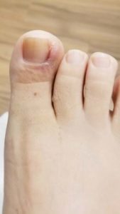 Ingrown toenails hurt! There is no disputing that fact. An ingrown toenail is caused from the toenail growing into the side of the skin (nail fold) of the toe. You can experience an ingrown toenail on any toe but usually the big toes are the most common. Wearing tight shoes can worsening this condition and cause more inflammation at the ingrown nail.