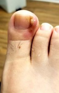 There is not a specific cause for the ingrown nail, it is simply the nail has started to grow in a more curved nature causing the problem. I will often see patients that have been dealing with the ingrown nail for months. They may have been performing soaks and taking antibiotics but can never fully resolve the pain or inflammation. If the nail is not removed from the skin, then bacteria will continue to cause an infection which we call a paronychia.